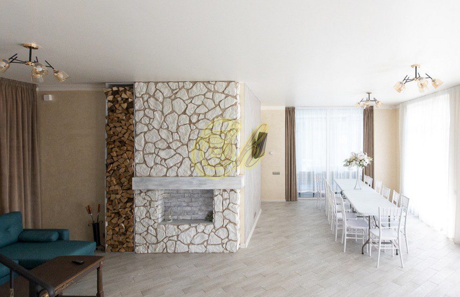 • гостиная с камином и большим столом.