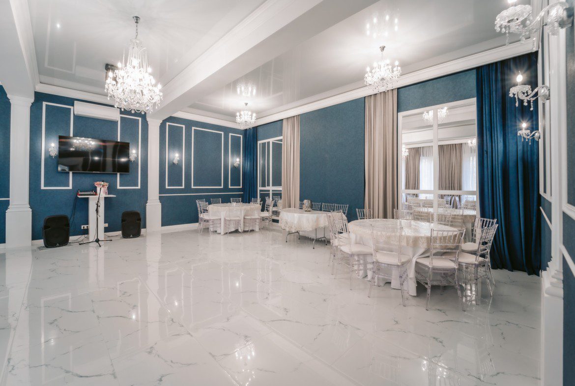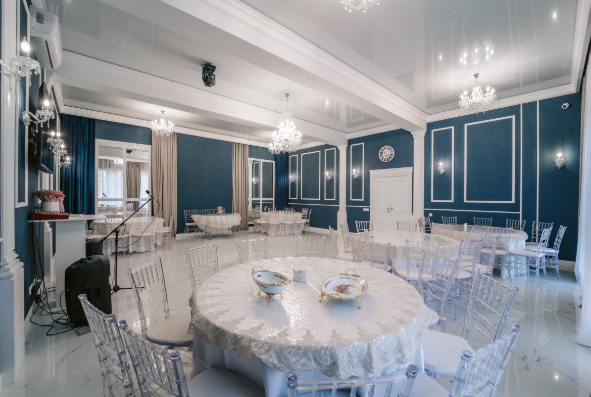 • банкетный зал на 54 персоны (Панорамные окна; потолок 4 метра), Зал выполнен в ресторанном стиле.