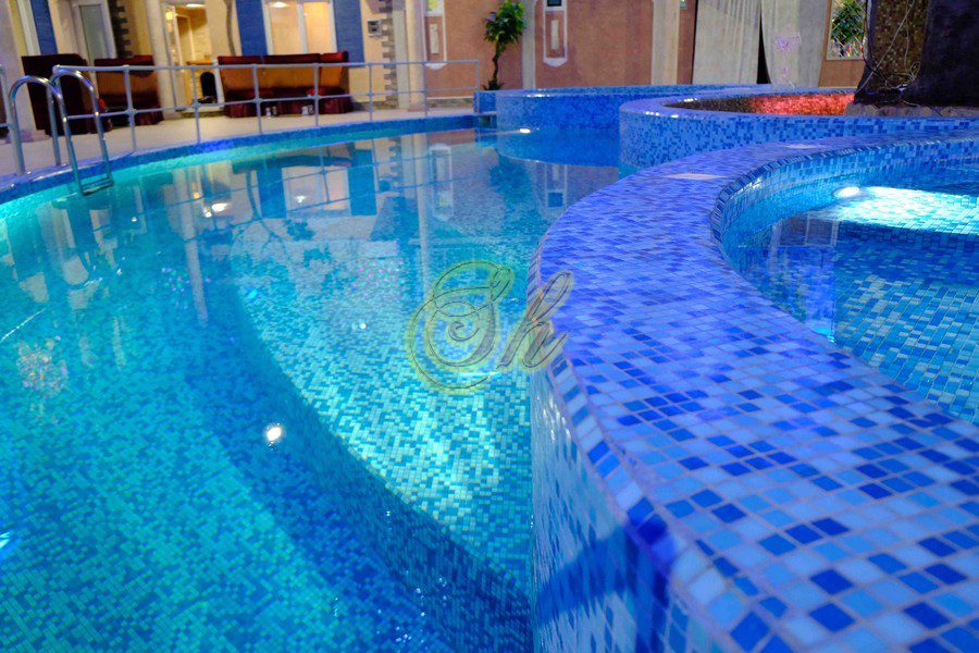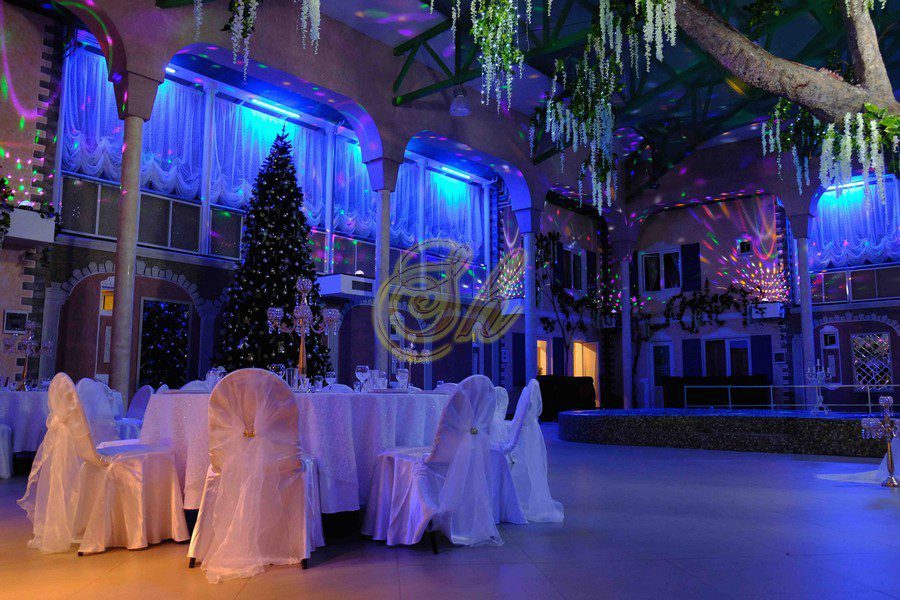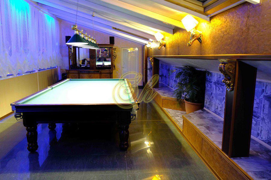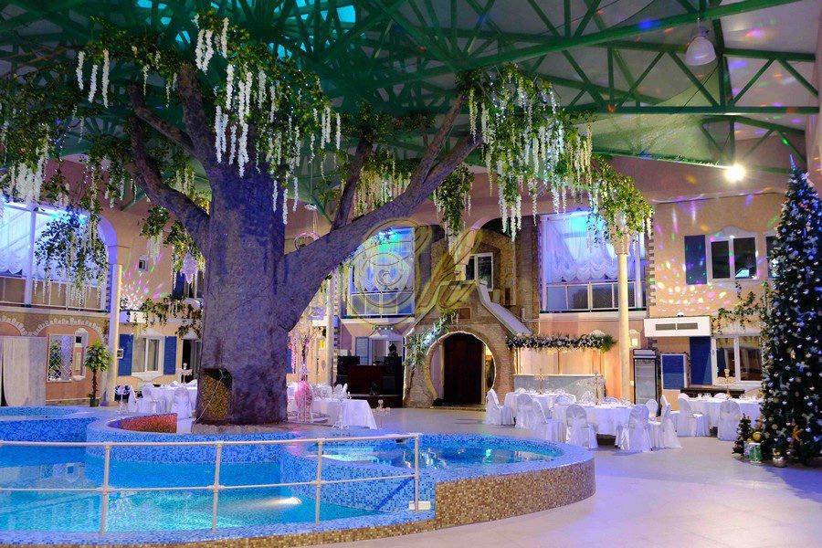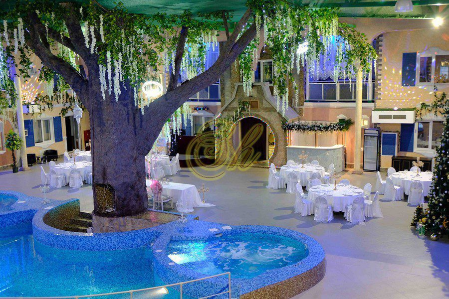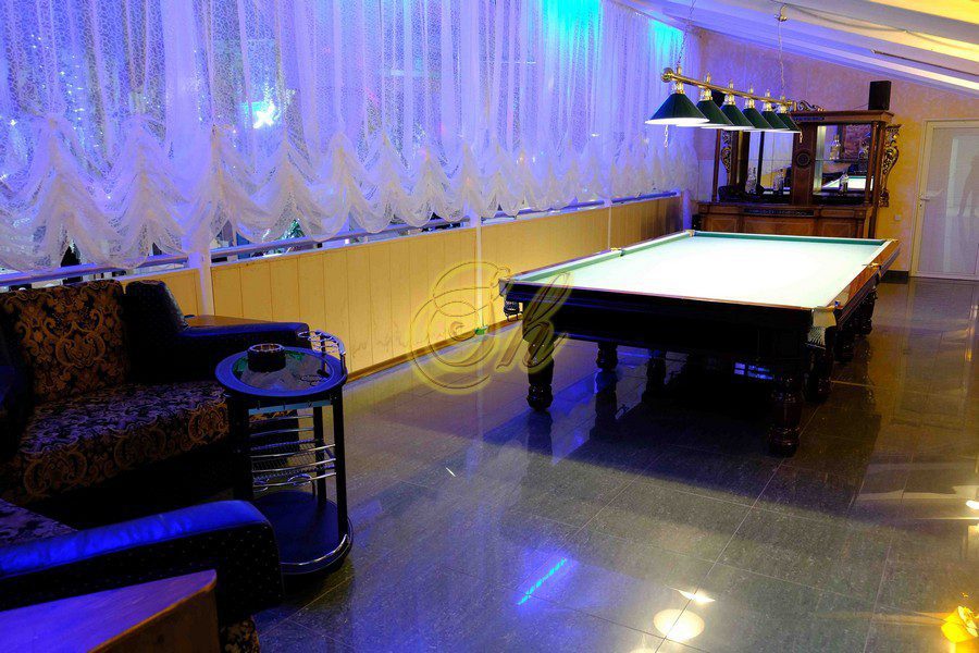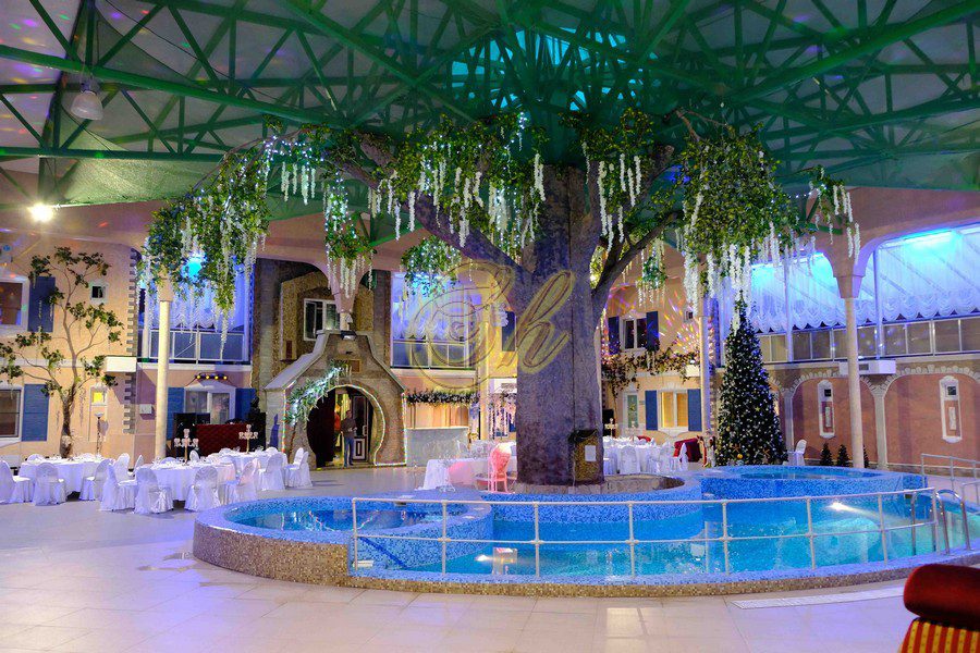 Комплекс разделен на отдельные 5 апартаментов ( 3 апартамента с русской баней, 1 апартаменты с хаммамом и 1 апартаменты без бани). Апартаменты двухэтажные и из каждого апартамента есть свой выход в главной банкетный зал с бассейном и деревом. Также имеется русский бильярд 12 футов.
