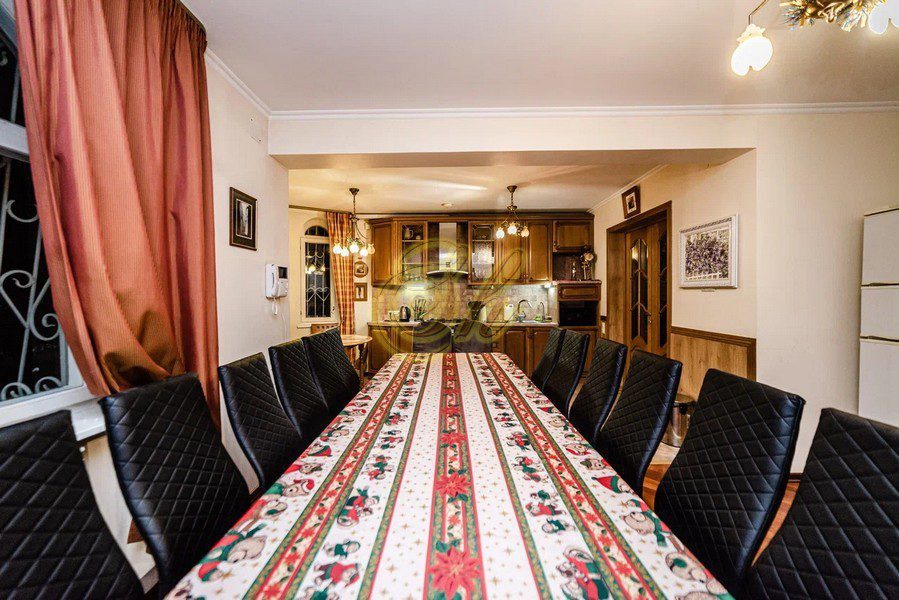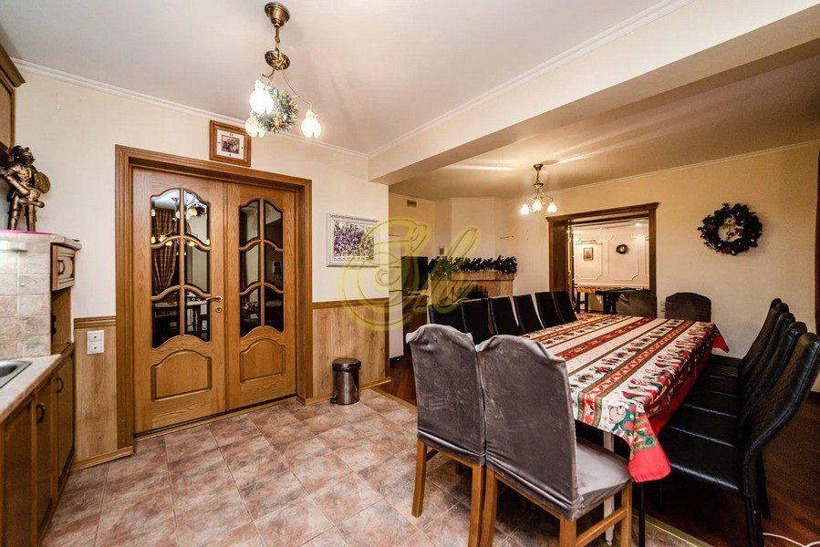 • просторная кухня-столовая с большим столом и камином.