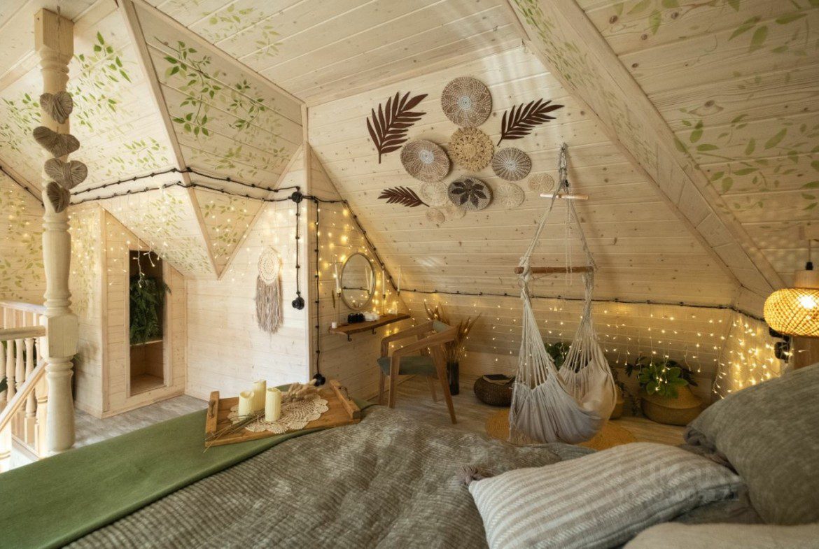 Для тех, кто мечтает просыпаться под свет сережек ясеня, что нежно отражаются в каскадном макраме над изголовьем кровати и на люстрах. Здесь светлое дерево встречается с мягкими салатовыми оттенками, создавая свежесть и лёгкость в каждом уголке. Панорамное окно открывает живописный вид на природу, а уютная кровать-татами, постеры с растительными мотивами и подвесное кресло приглашают расслабиться.