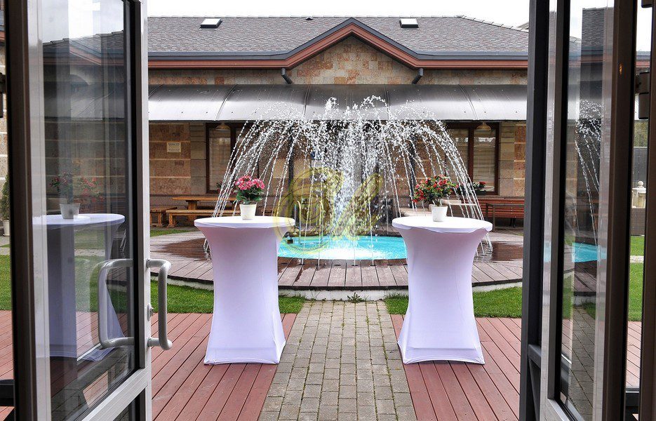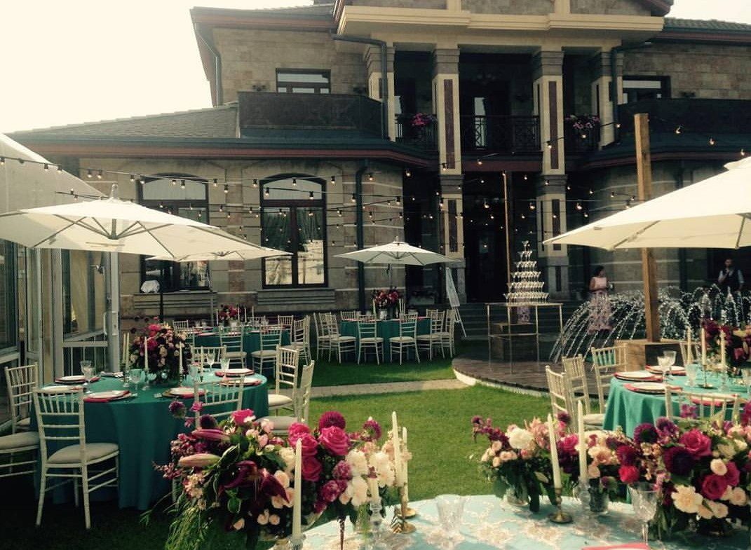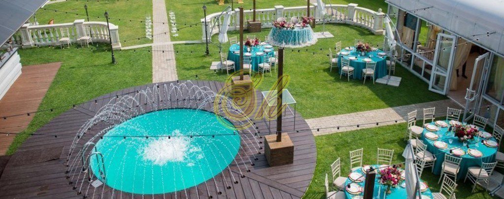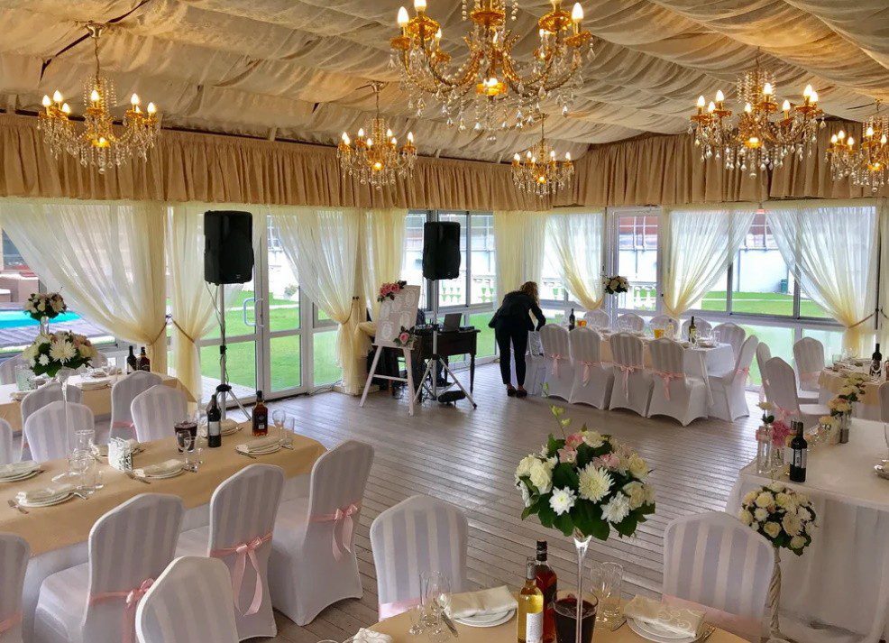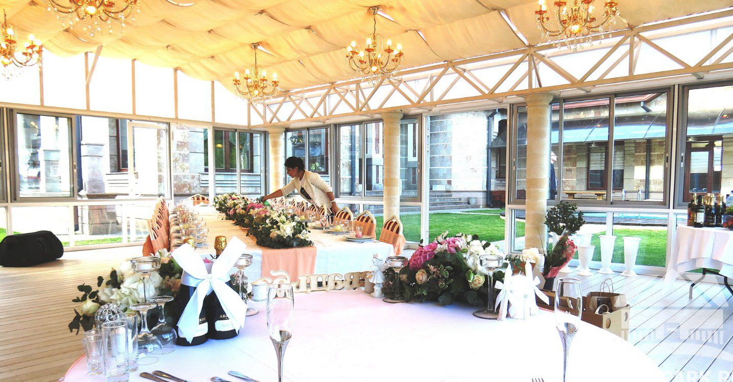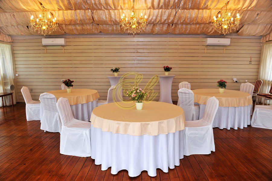 Кейтеринговый инвентарь (банкетная посуда, банкетный текстиль, столы, стулья, скатерти, чехлы, салфетки и пр.) 1000 рублей/человек или 90 рублей/1 позиция Банкетное меню с обслуживанием от 3000 рублей (Без алкоголя. Пробковый сбор отсутствует). Аренда профессиональной кухни для стороннего “кейтеринга” – 500 рублей/человек. Банный чан под открытым небом 5000 рублей/сеанс Оформление зала, ведущий, диджей, фотограф по запросу. Оформление коттеджа воздушными шарами – по запросу. БЕСЕДКА для торжеств оплачивается отдельно 50000р/сутки.
